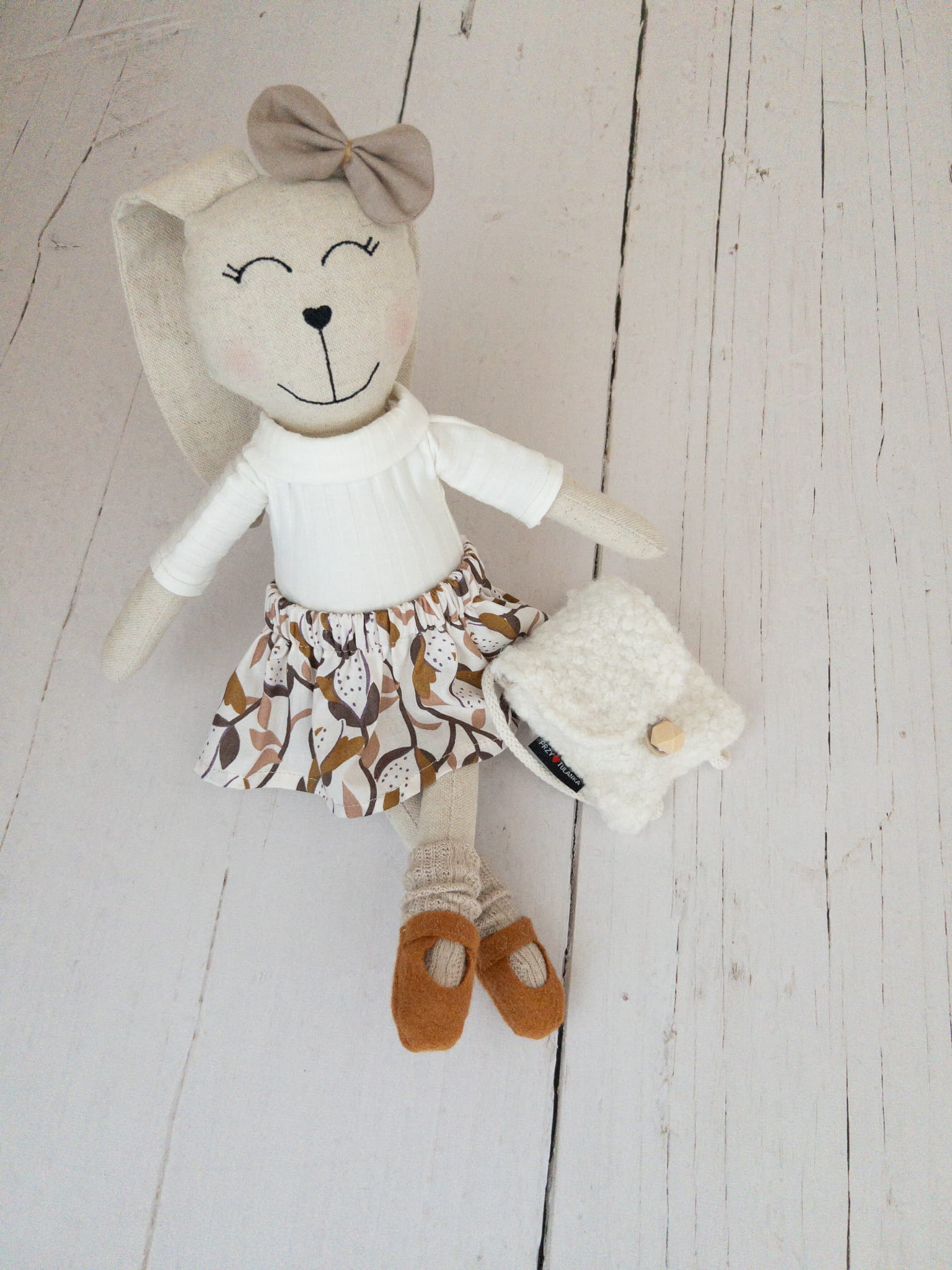 Królisia ubrana w prążkowany śmietankowy golf oraz bawełnianą kwiatową spódniczkę. Dodatkowo ma na sobie podkolanówki sweterkowe, ciepłe buciki i uroczą kokardkę. Wszystkie elementy można zdejmować. Plecak nie jest zawarty w ofercie ;)