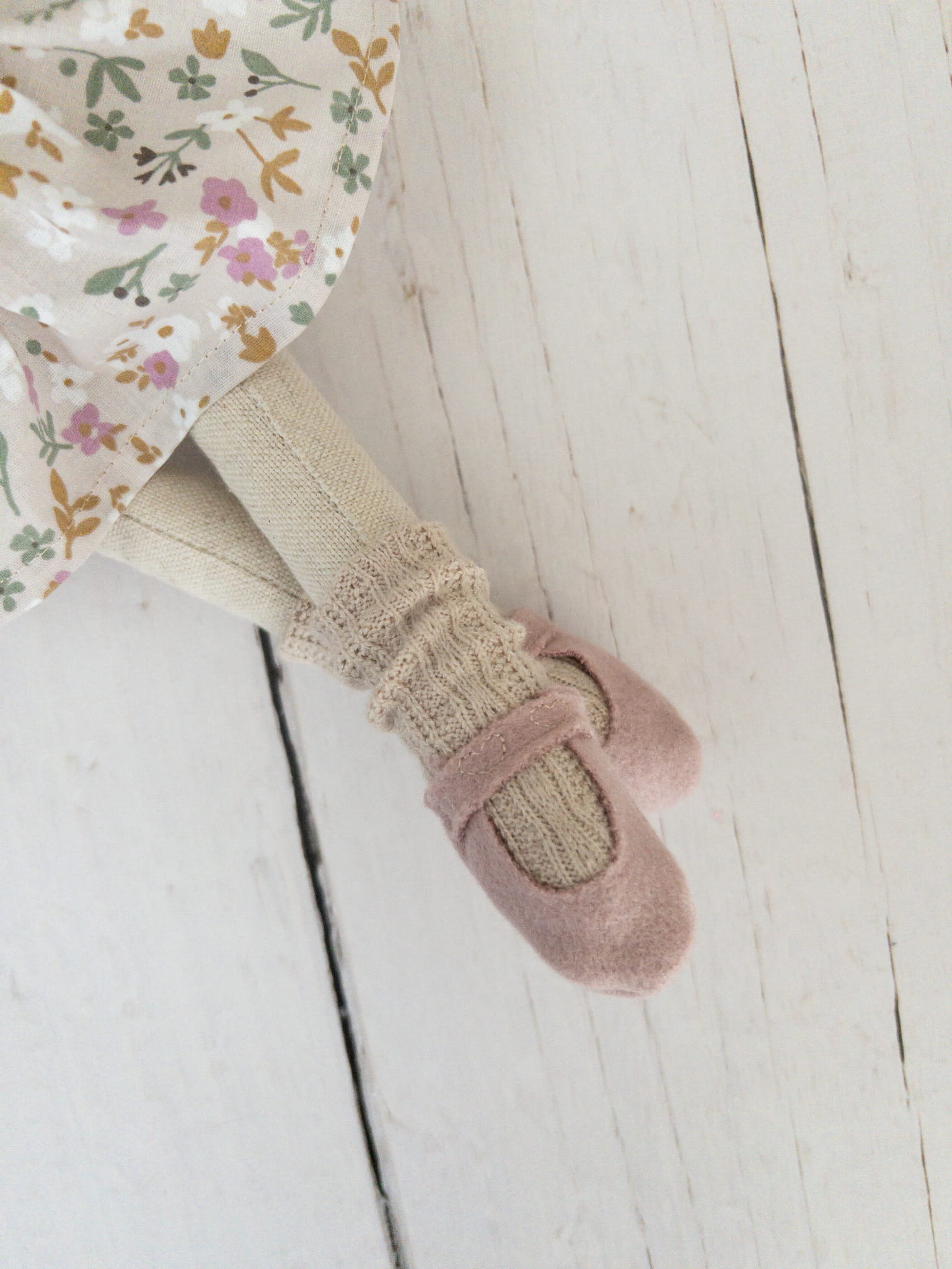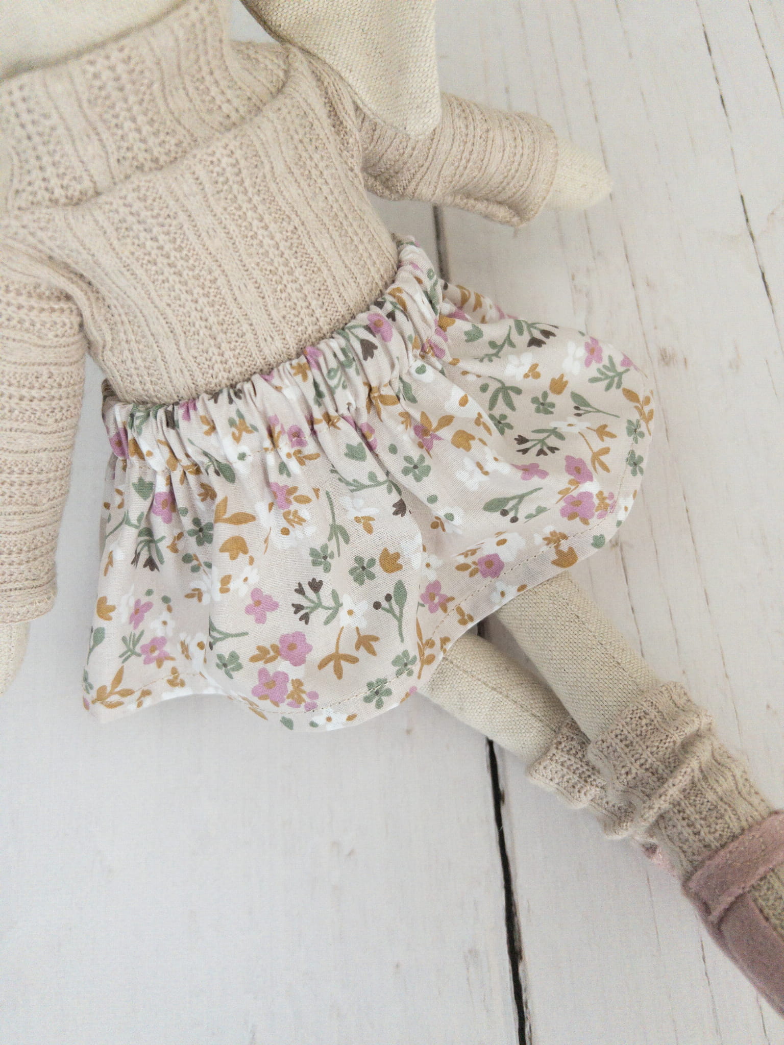 Królisia ubrana jest w sweterkowy golf oraz bawełnianą kwiatową spódniczkę. Dodatkowo ma na sobie podkolanówki sweterkowe, ciepłe buciki i uroczą kokardkę. Wszystkie elementy można zdejmować.