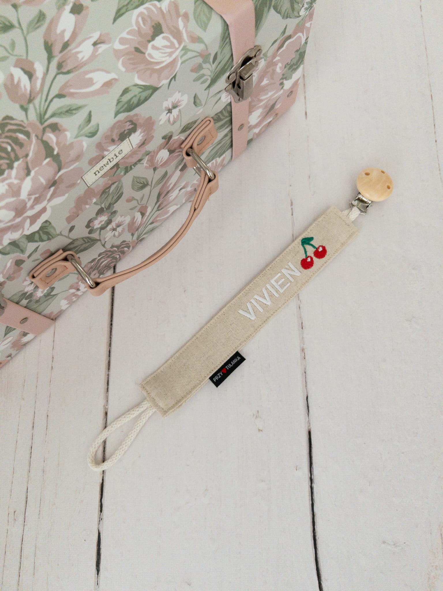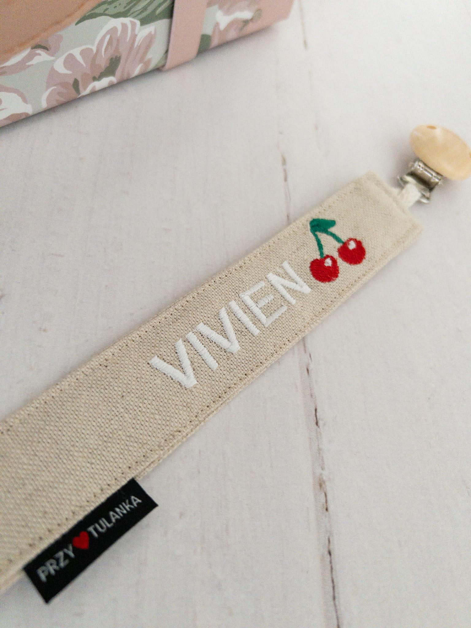 Lniana zawieszka do smoczka WISIENKI drewniany klips