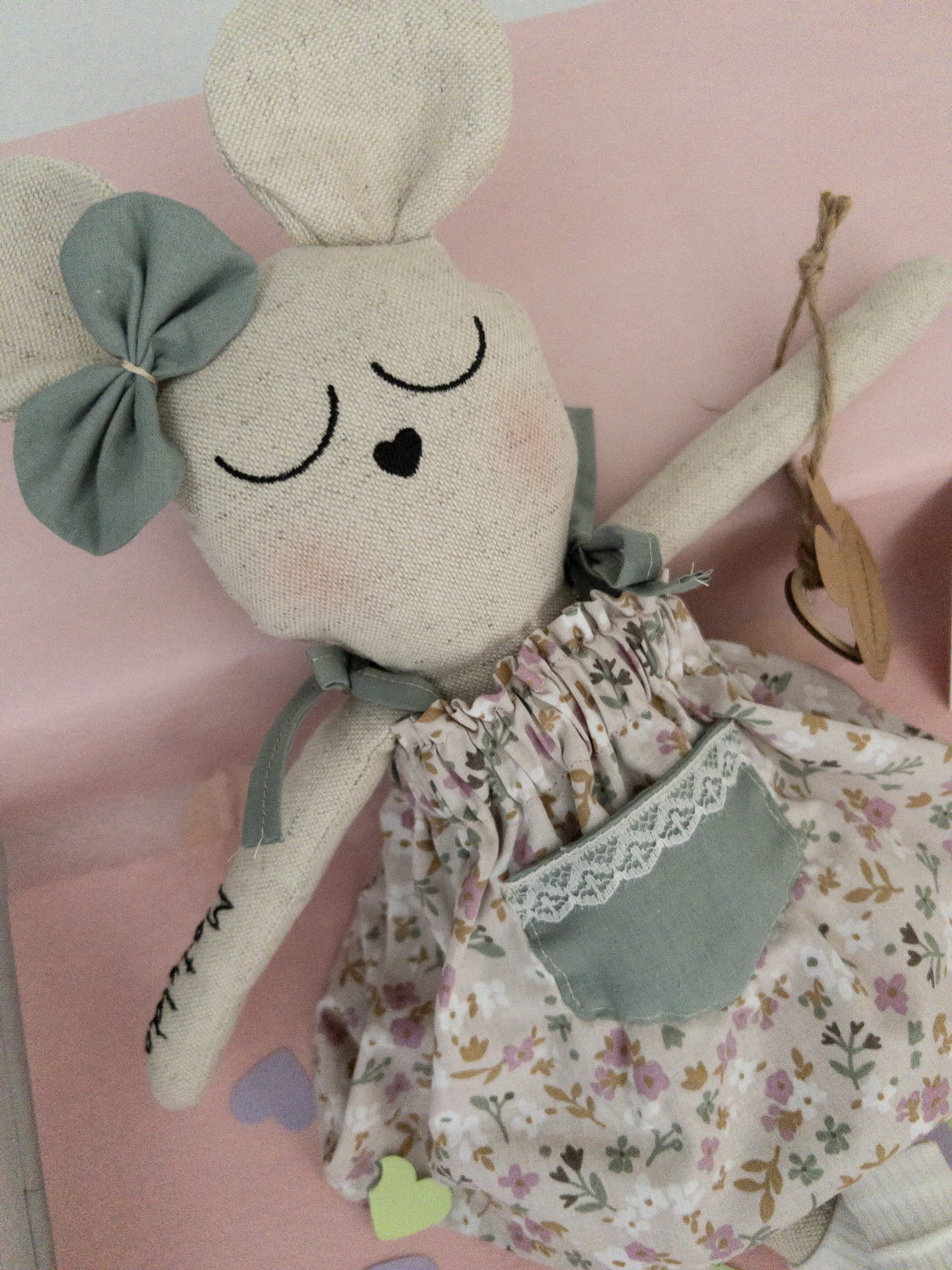 Myszka z ozdobną kokardką w pięknej sukience w kwiatuszki z kieszonką, wiązana na tasiemki.