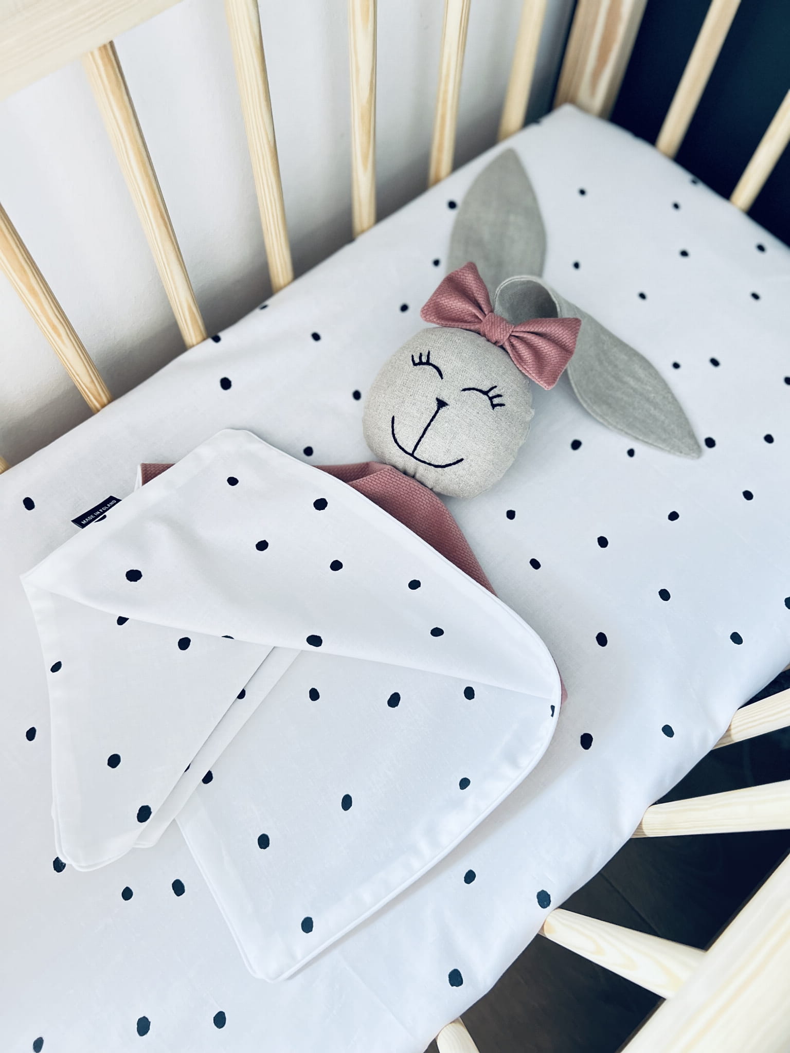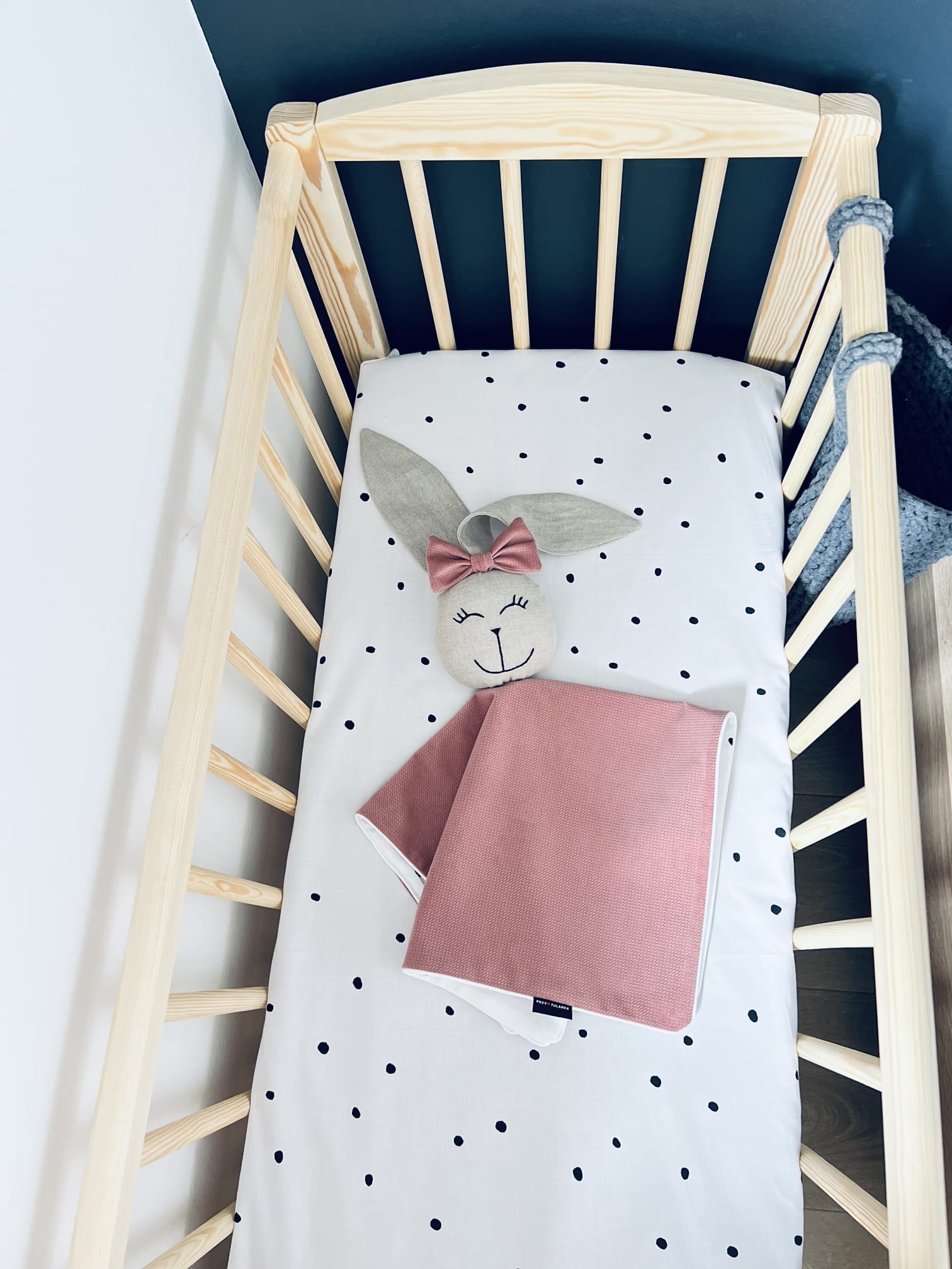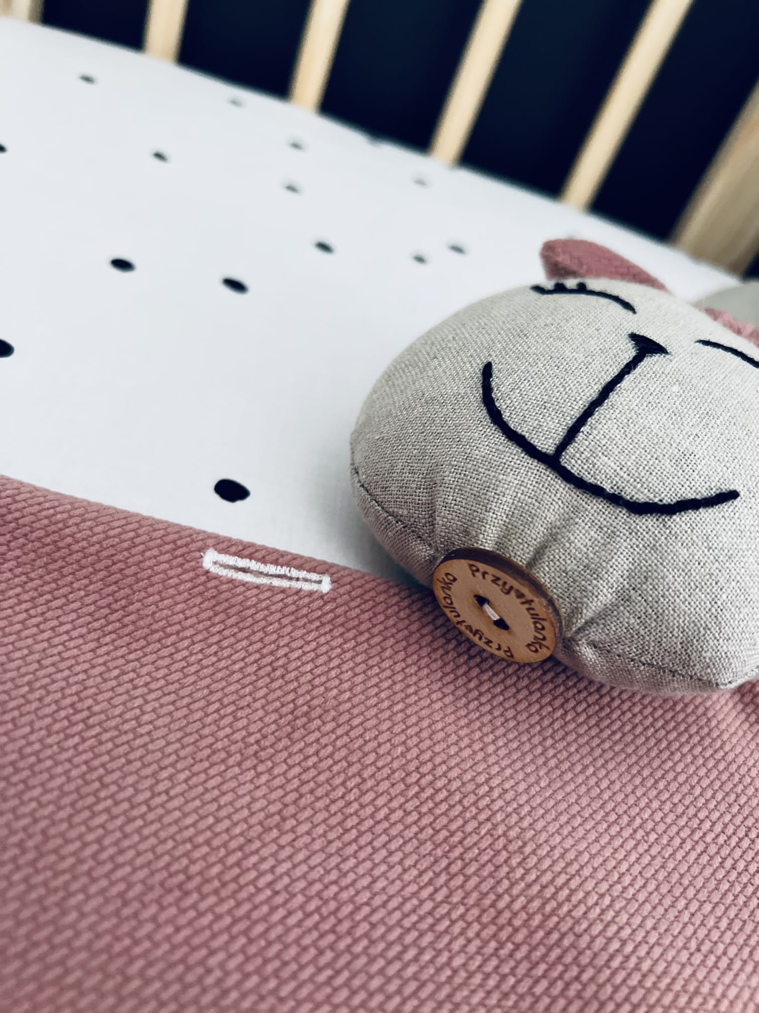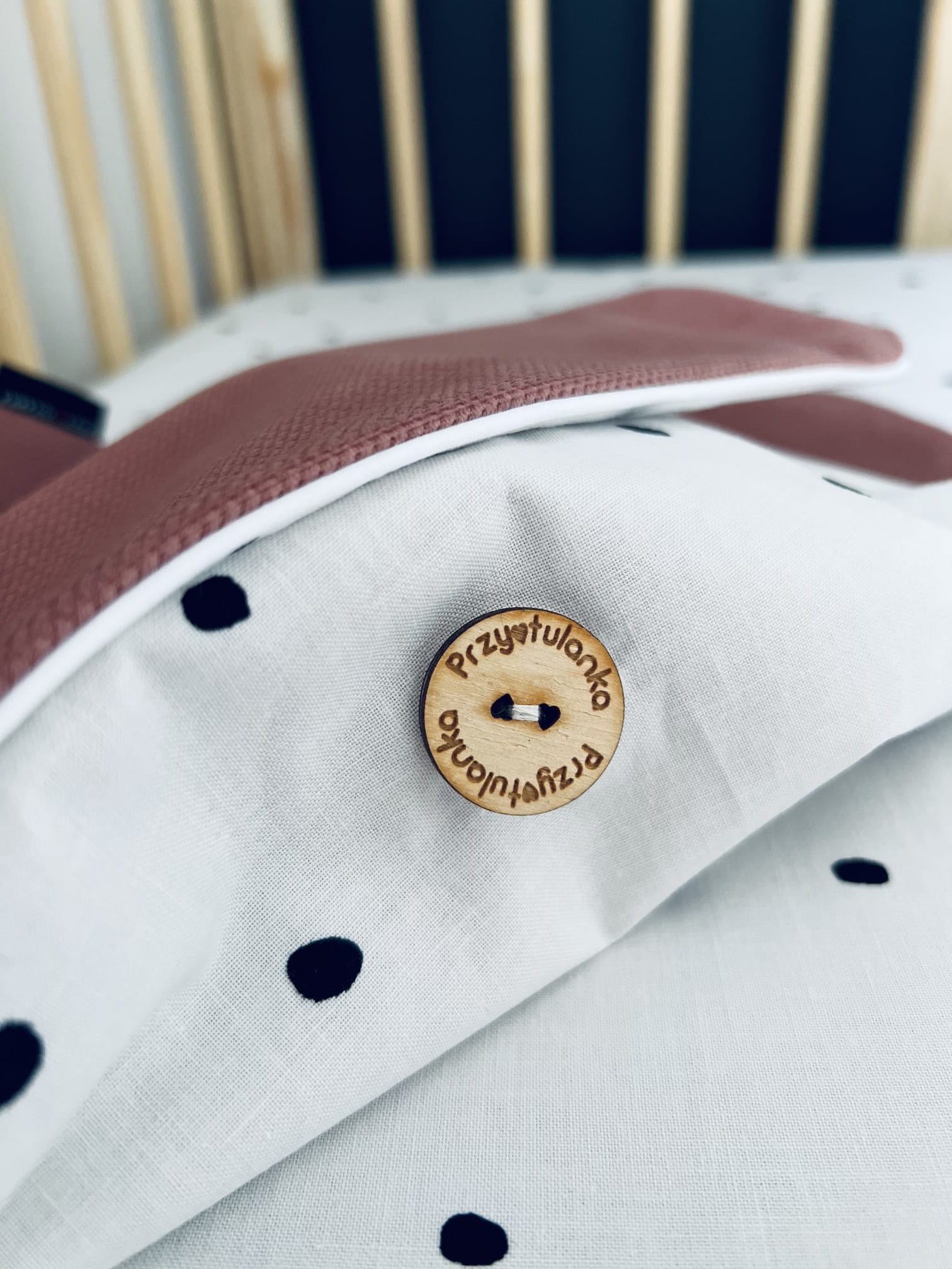 Kocyk zaś wykonany jest z połączenia miękkiego Velvetu oraz Bawełny premium. Razem połączone są drewnianym guziczkiem - kocyki można wymieniać gdy zajdzie taka potrzeba - każdy ma wyszytą dziurkę!