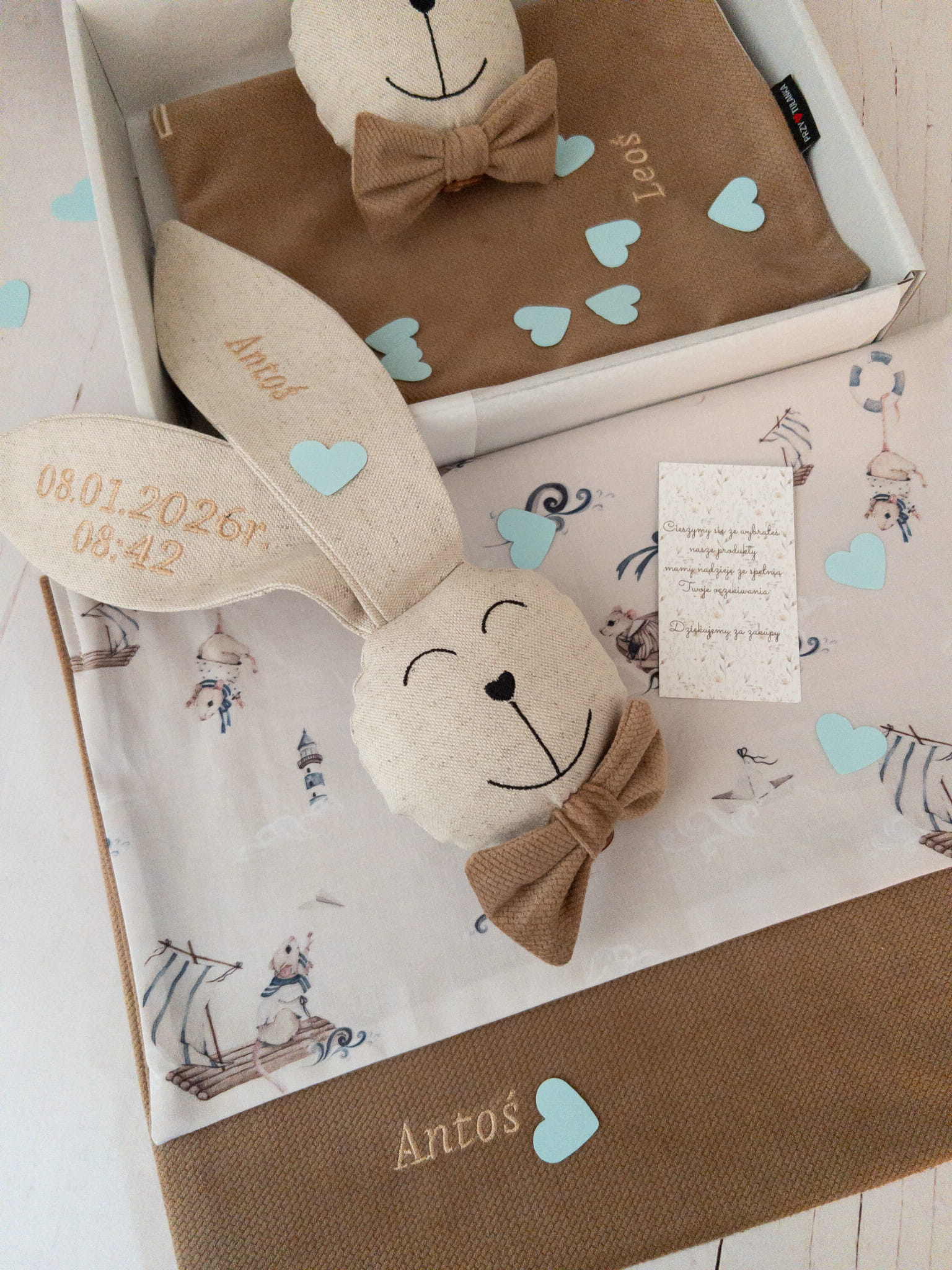 Kocyk zaś wykonany jest z połączenia miękkiego Velvetu oraz Bawełny premium. Razem połączone są drewnianym guziczkiem - kocyki można wymieniać gdy zajdzie taka potrzeba - każdy ma wyszytą dziurkę!