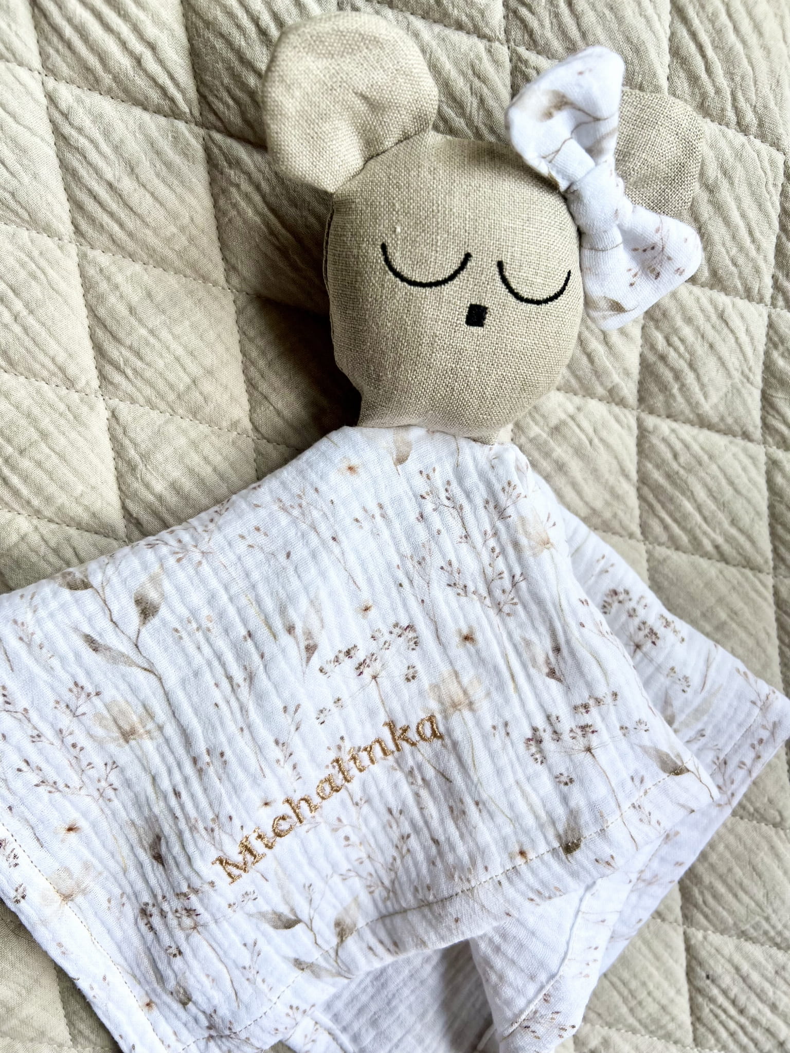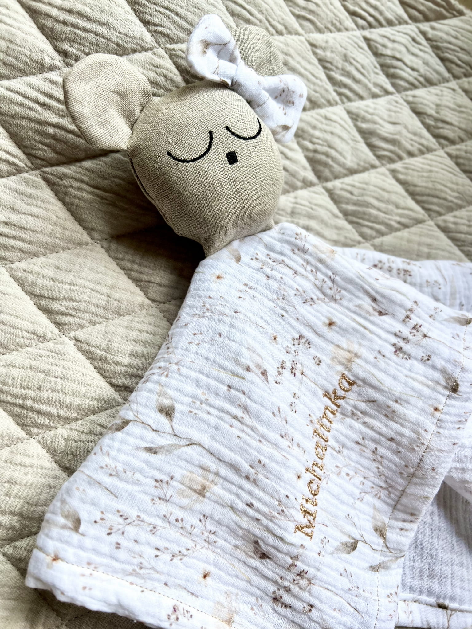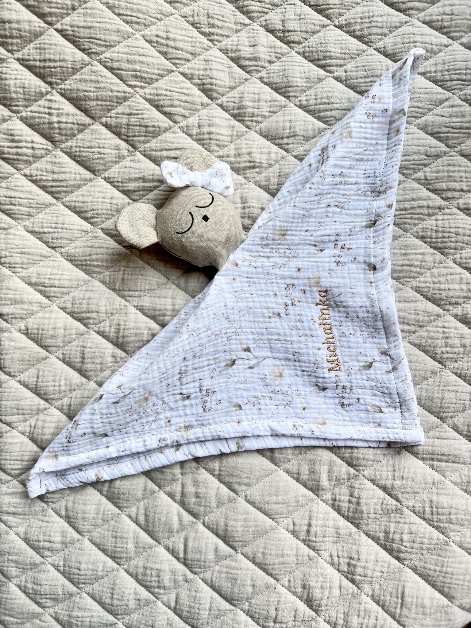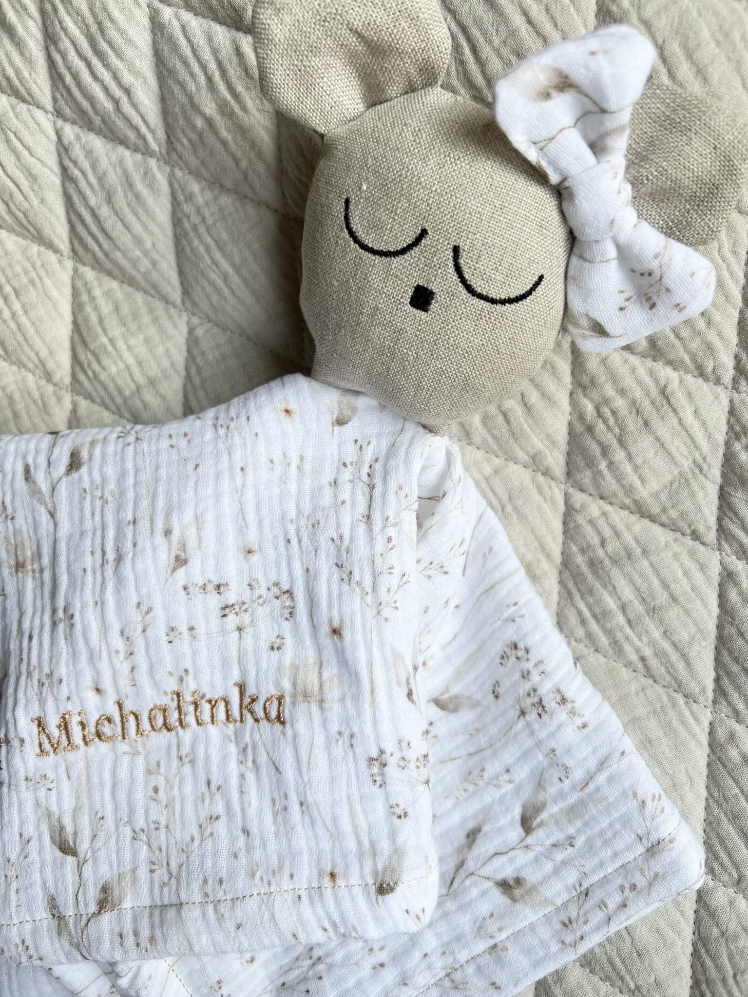 Delikatny muślin drukowany w połączeniu z lnem jest bezpieczny dla buzi maluszka.