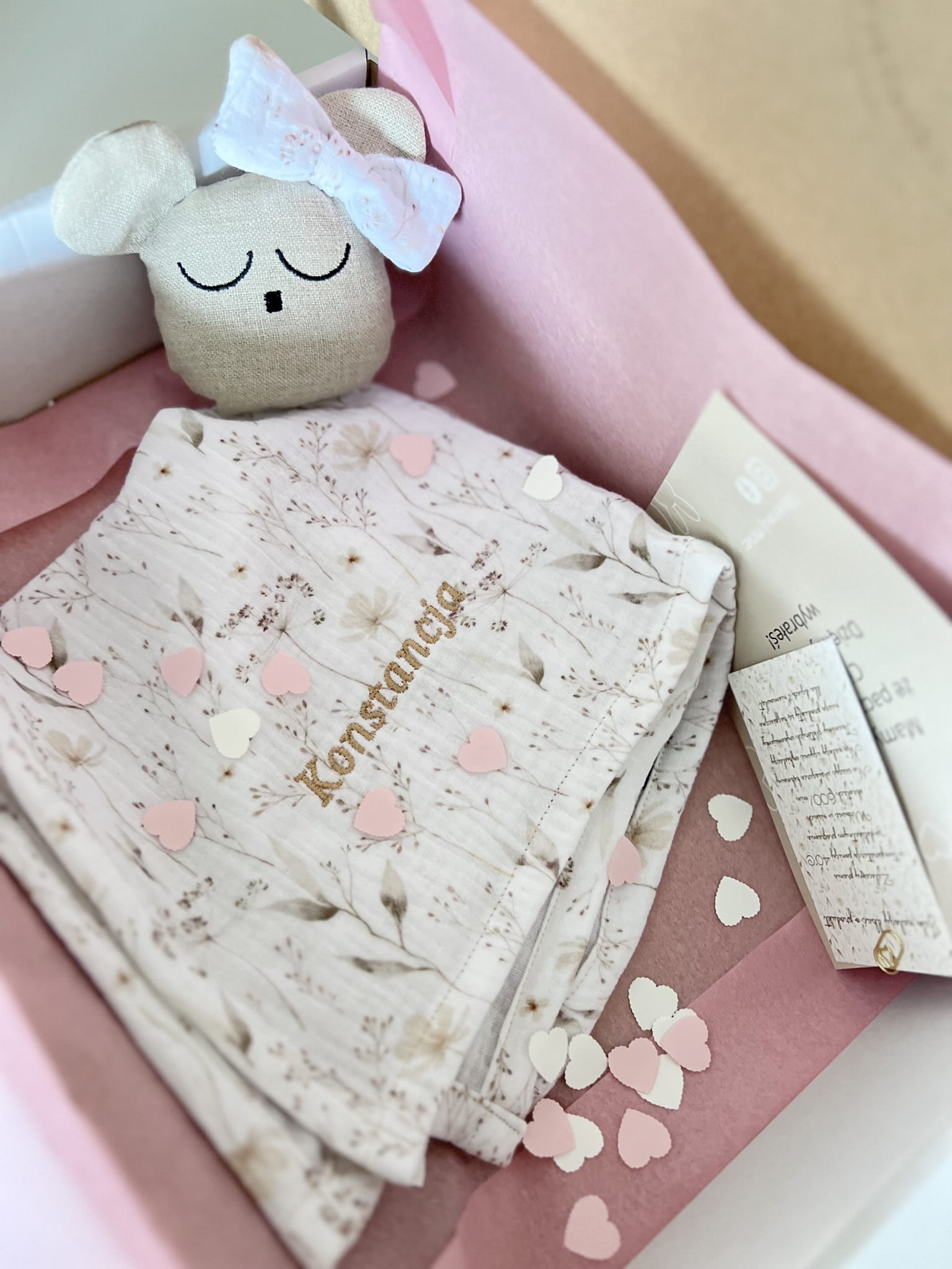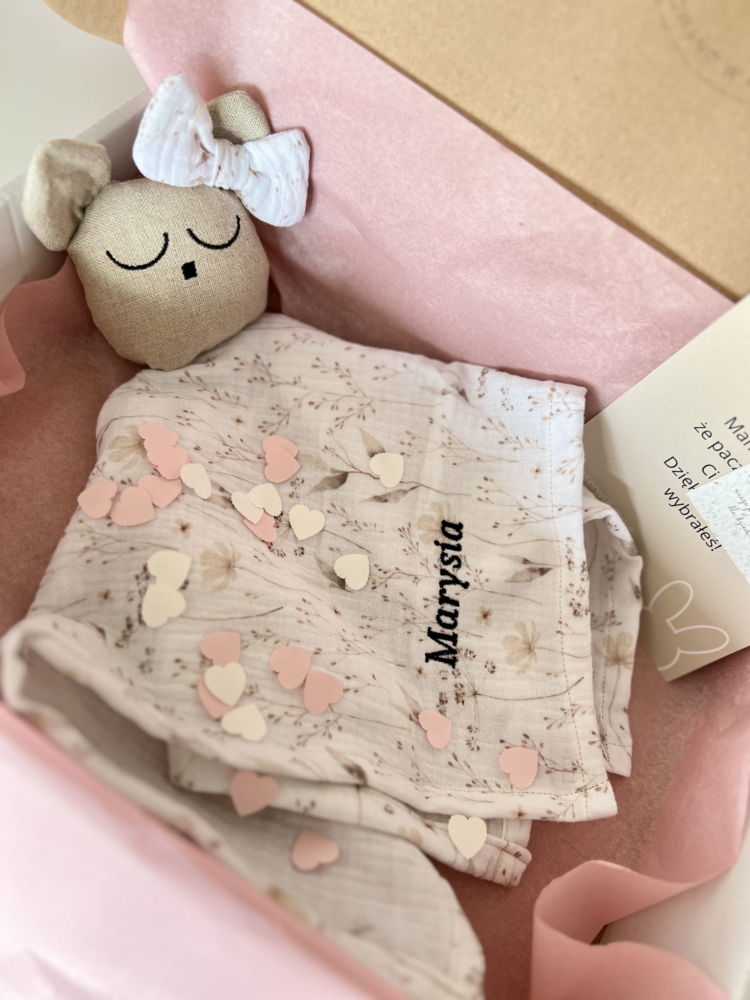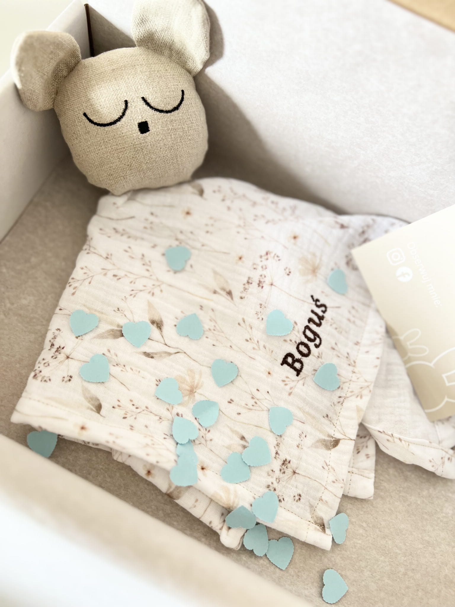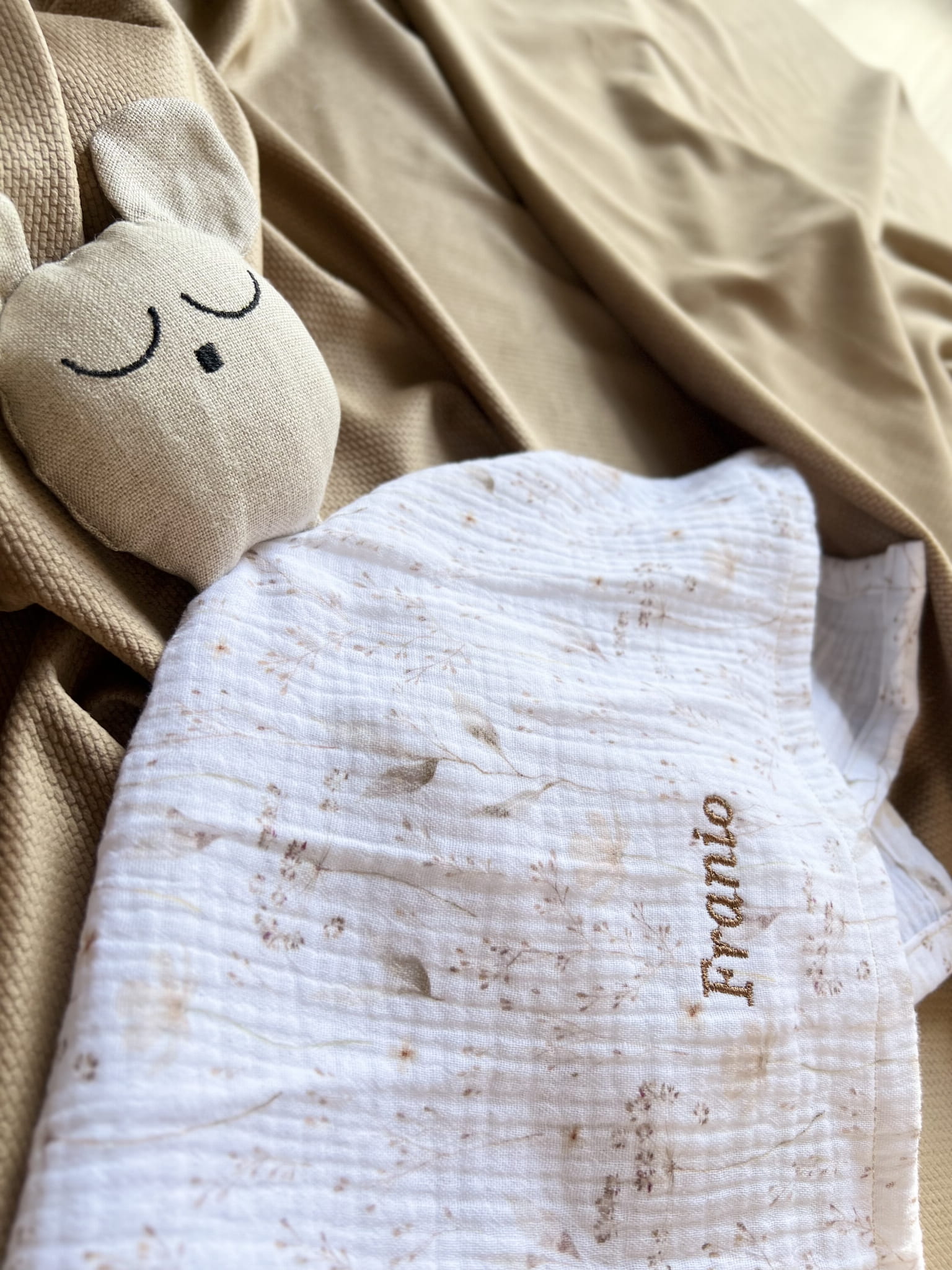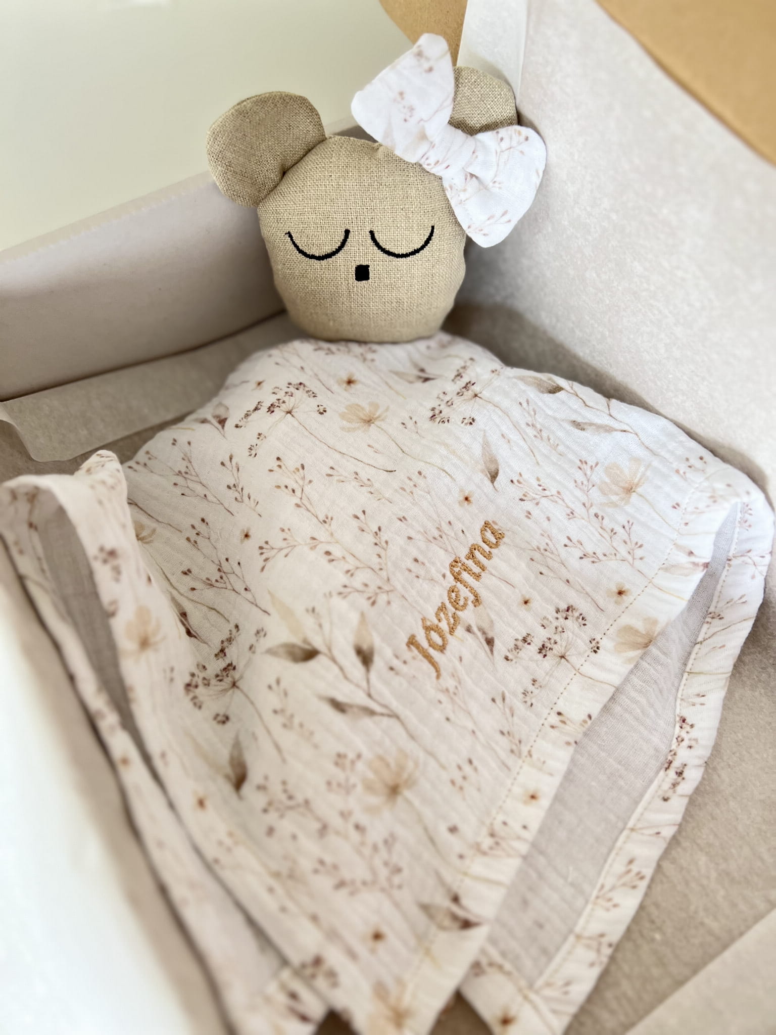 Delikatny muślin drukowany w połączeniu z lnem jest bezpieczny dla buzi maluszka.