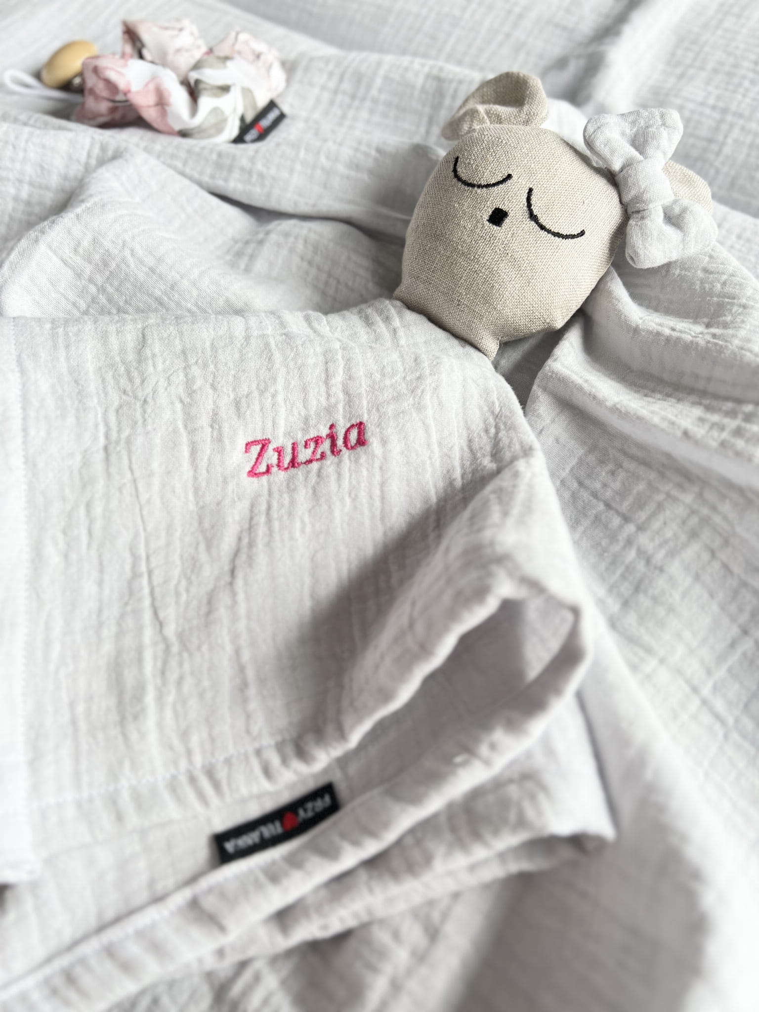 Delikatny muślin bawełniany w połączeniu z lnem jest bezpieczny dla buzi maluszka.