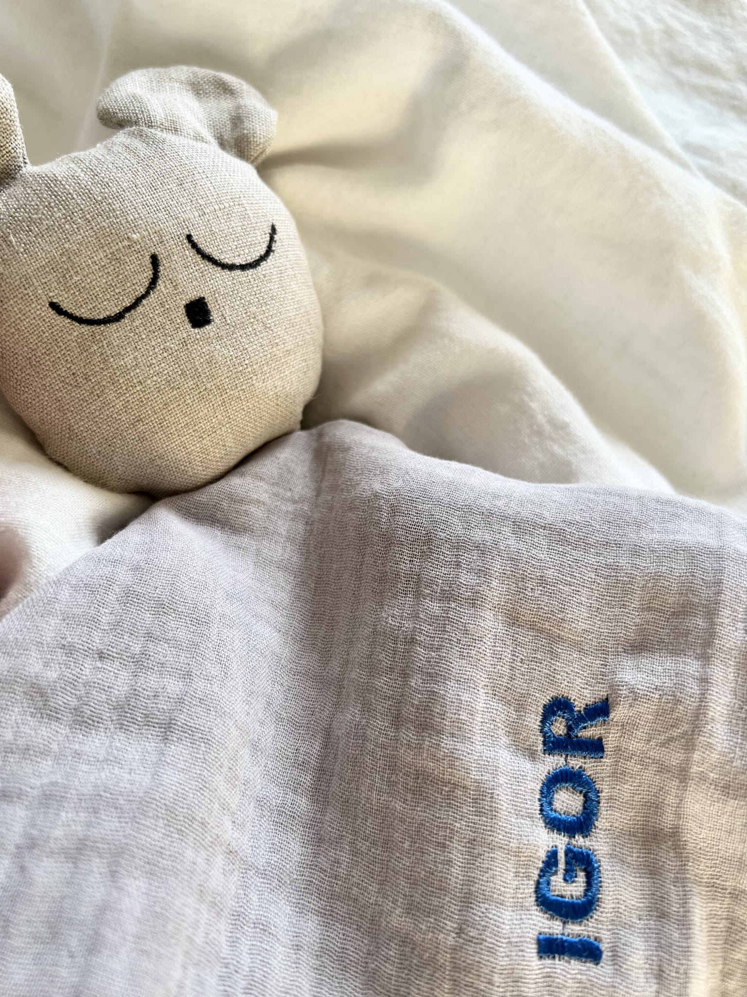 Delikatny muślin bawełniany w połączeniu z lnem jest bezpieczny dla buzi maluszka.