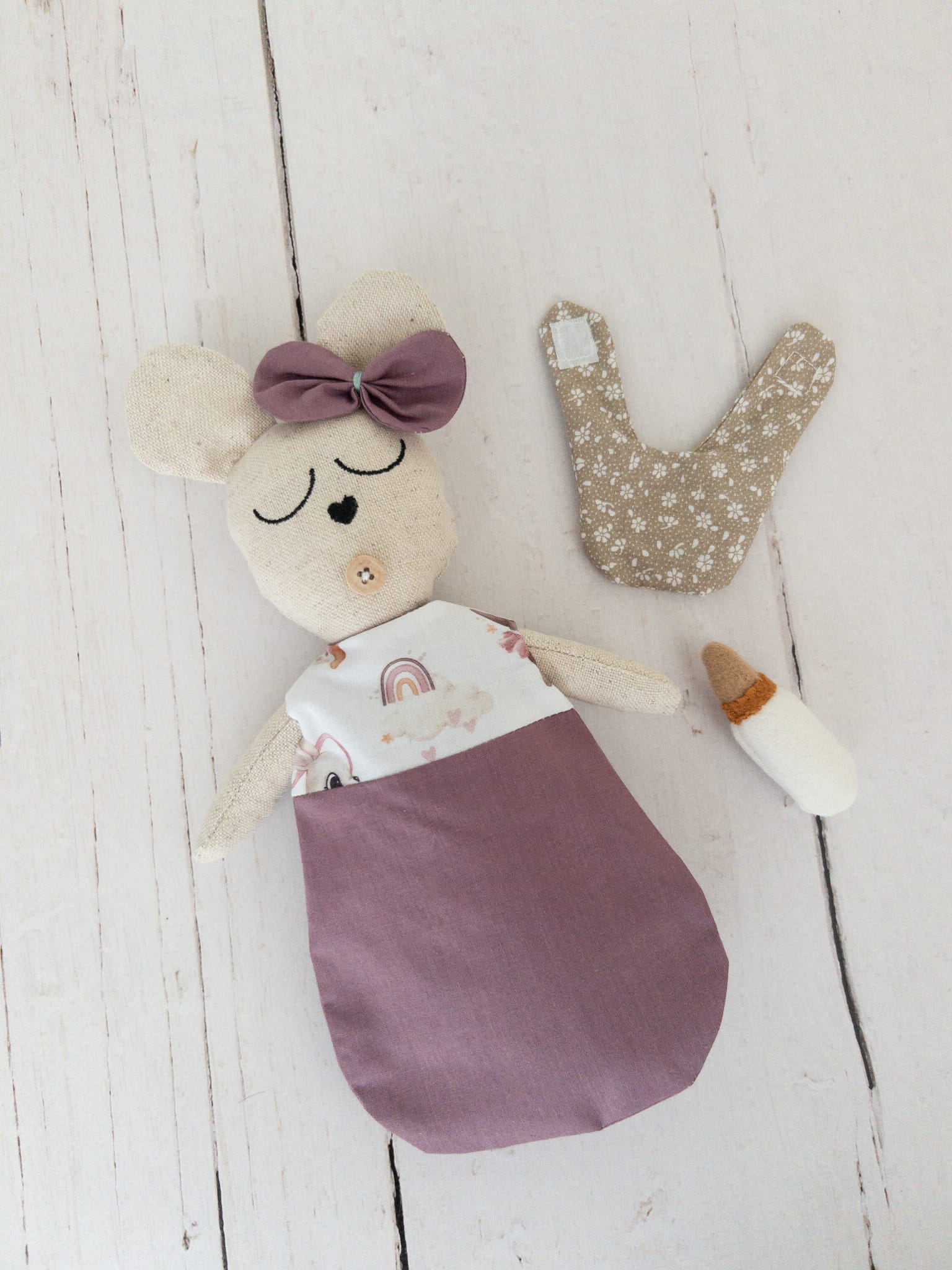 - myszka-przytulanka z kokardką, pieluszką, śliniakiem